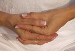 In the practice of using Mudras, the thumb indicates the Cosmic (Divine) principle of consciousness and the index finger represents the Individual (human) consciousness. The Jnana Mudra is considered the Mudra of Wisdom and is most commonly recognized as the position of the hands seen in support of a sitting meditation practice. In its simple form the fingers are relaxed and point downward (as in seated Buddha) and not interlaced.
