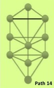 This path represents the element of Earth (Taurus) raised to the level of Divine action. Form has become formless in its ascent and what we conceive of as foundational earth, its structure and all of its evolving components have now evolved as the support and structure required for the blending of male and female, positive and negative, force and form. We think of earth as being the strength and the constant through which viable substance may pass and yield the fruits of that fertility. This is also true of the 14th Path. Through the support and structure of this path the fruits of emanation are yielded.
